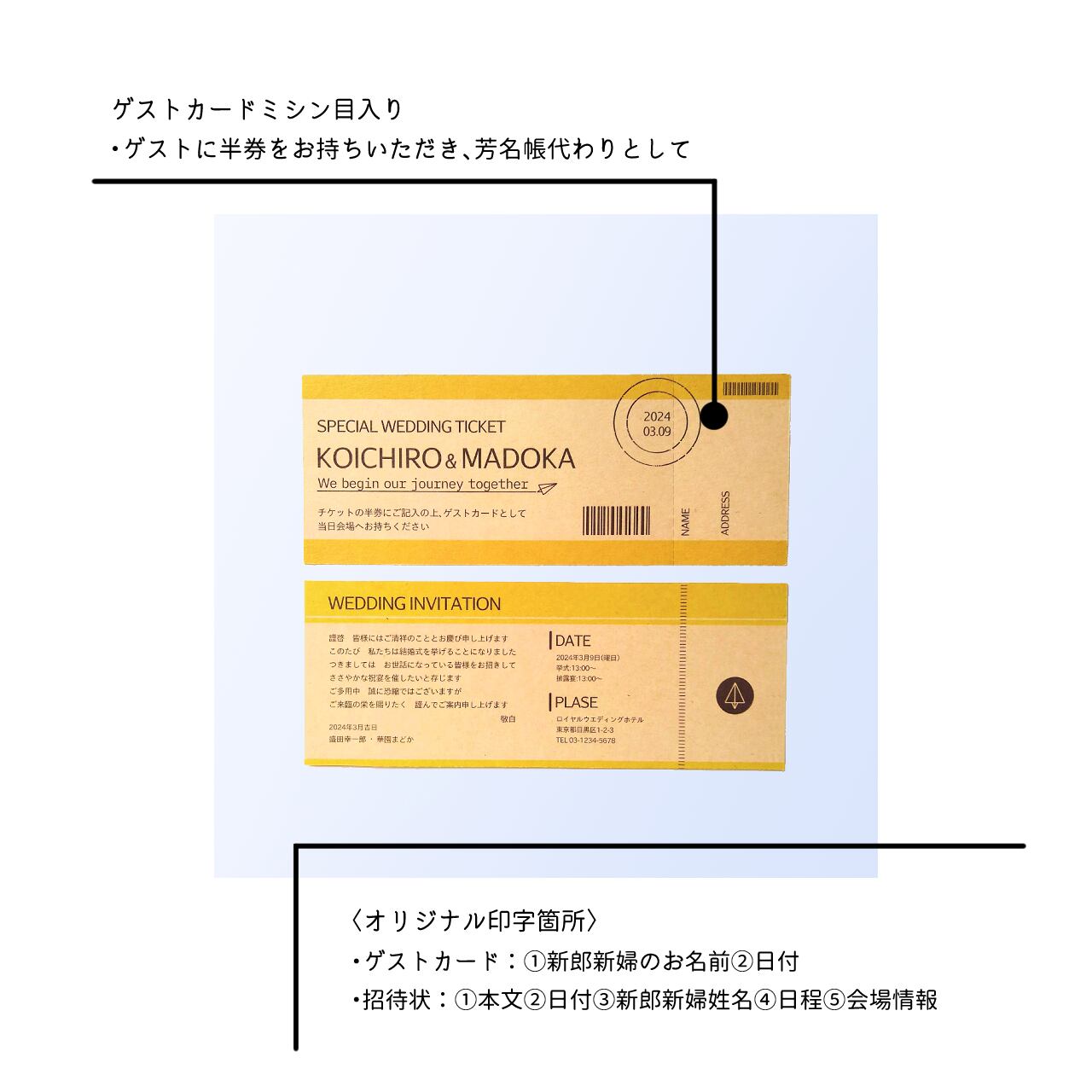期待感を高めるご招待に、ペアデザインが目を惹くチケットタイプ、サプライズ感が楽しいホルダータイプ(+¥2,100)よりお選びいただけます。