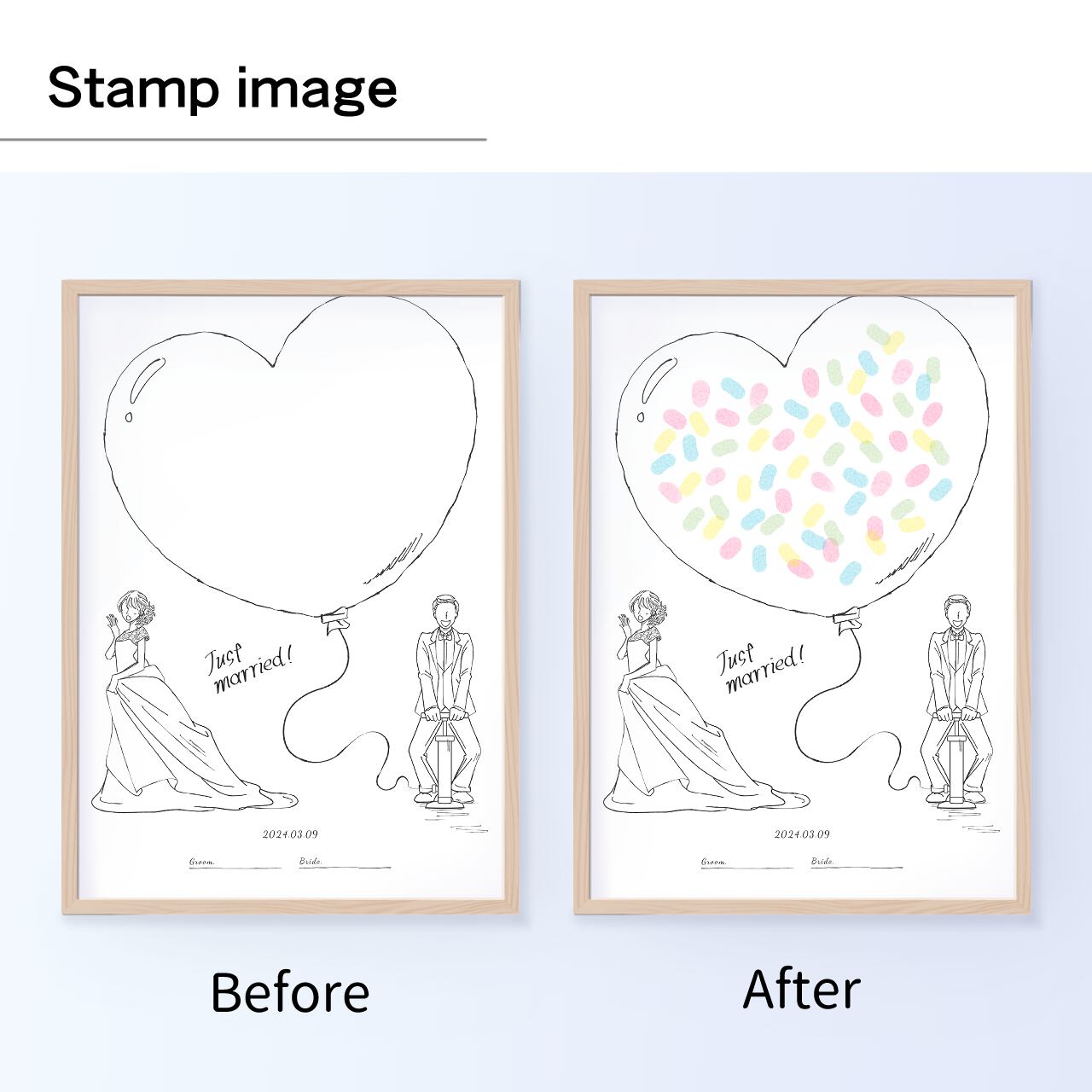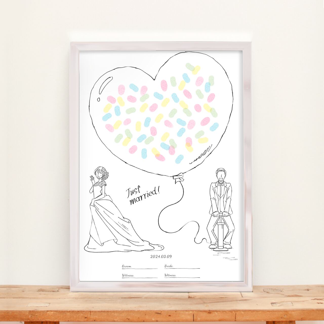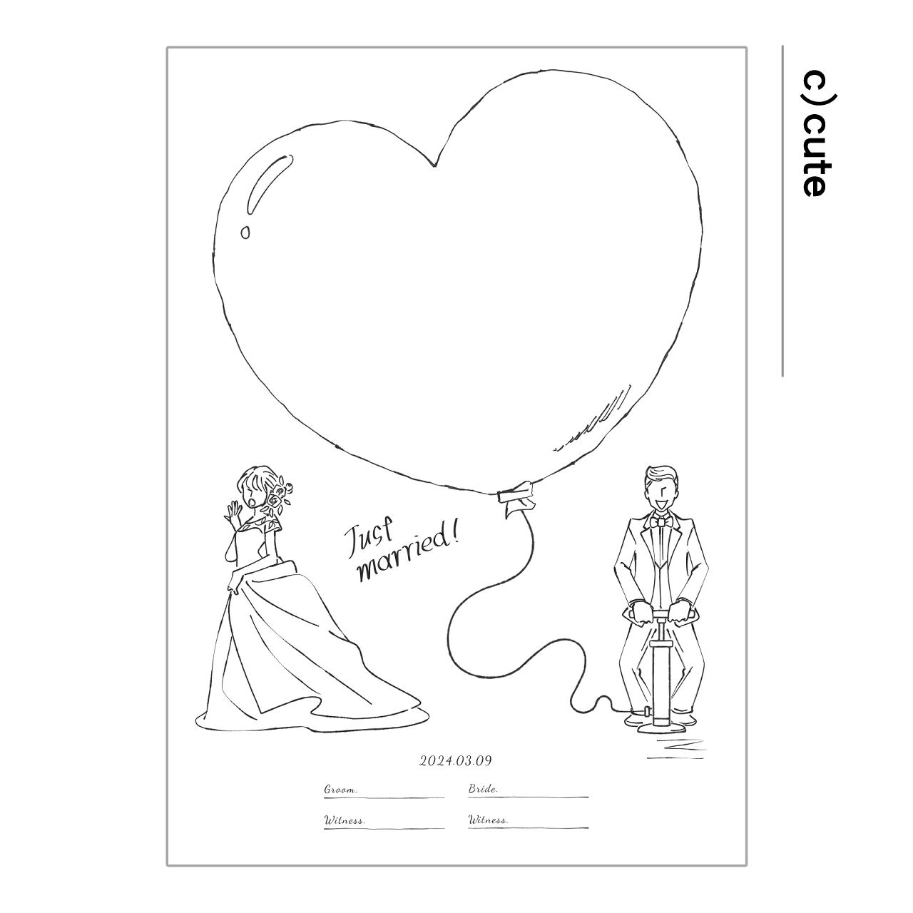 バルーンに祝福の捺印をのせて完成する、キュートなゲスト参加型ウエディングボードです。