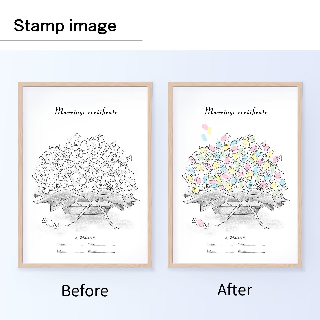 キャンディに捺印のフレーバーをのせて完成する、華やかなゲスト参加型ウエディングボードです。
