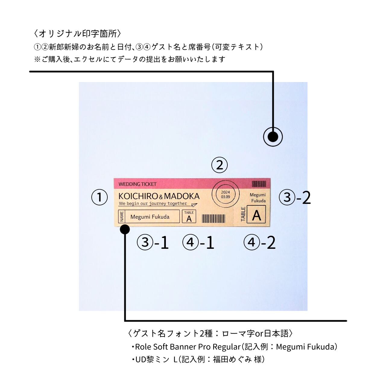 ・新郎新婦お名前、日付、ゲスト名、席番号