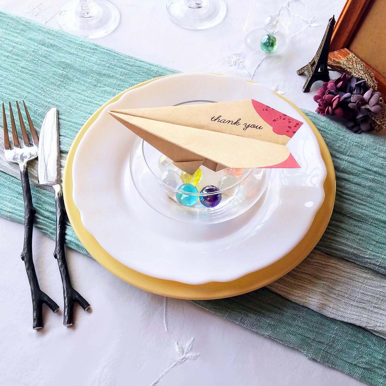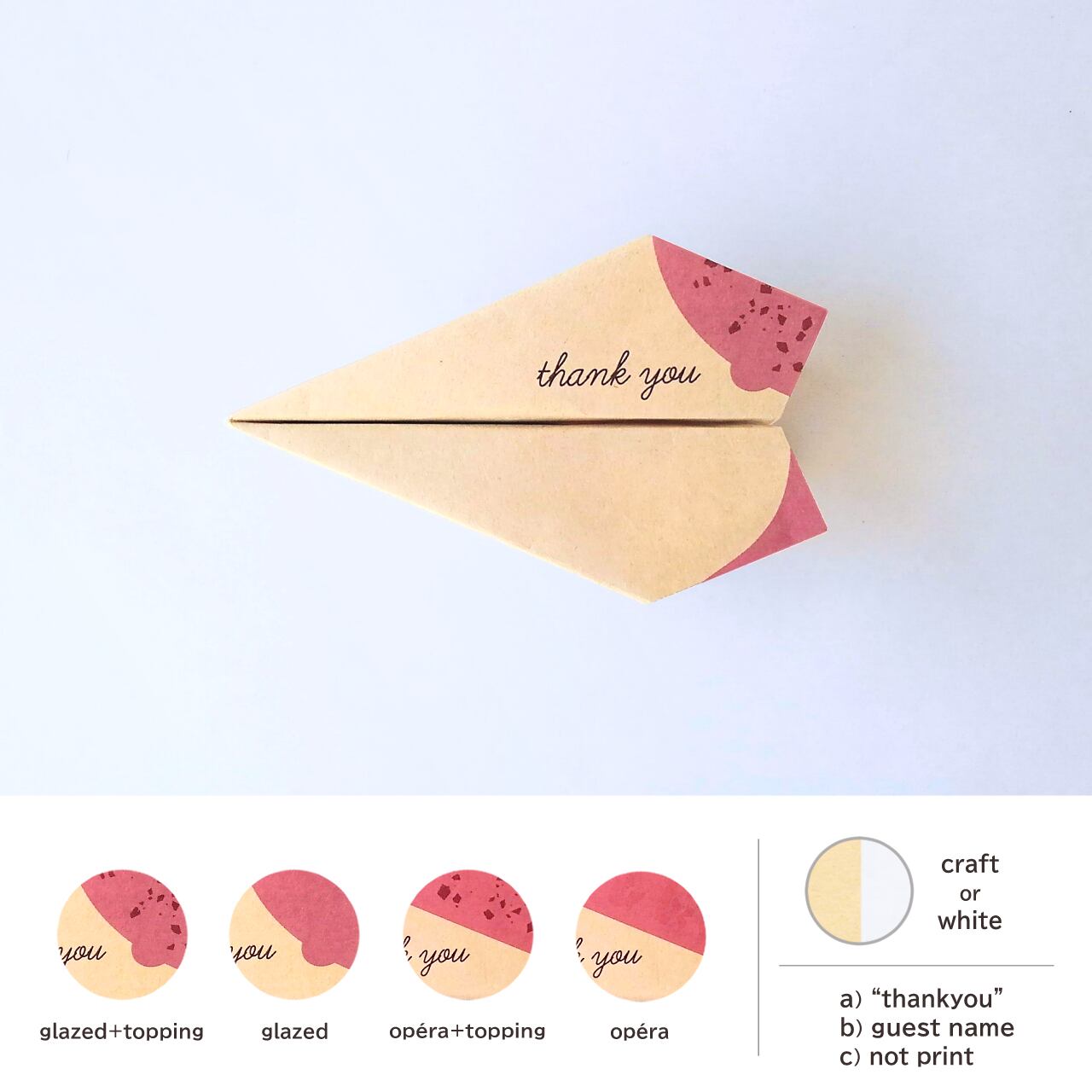海外でも人気の紙ひこうき席札を、ドーナツのトッピングを選ぶようにカスタマイズ。テーブルナンバーのデザインも、トータルコーディネートを意識して選べます。