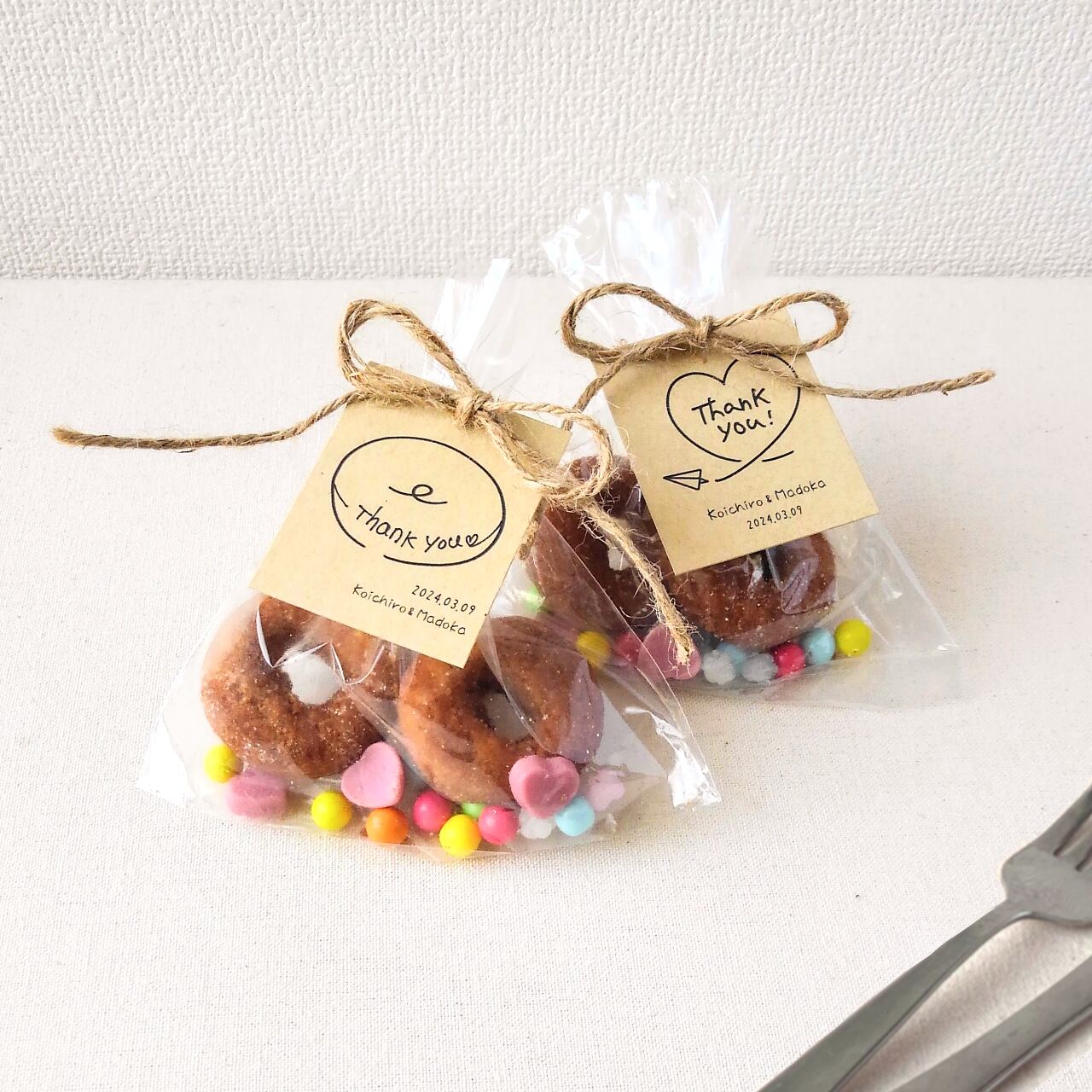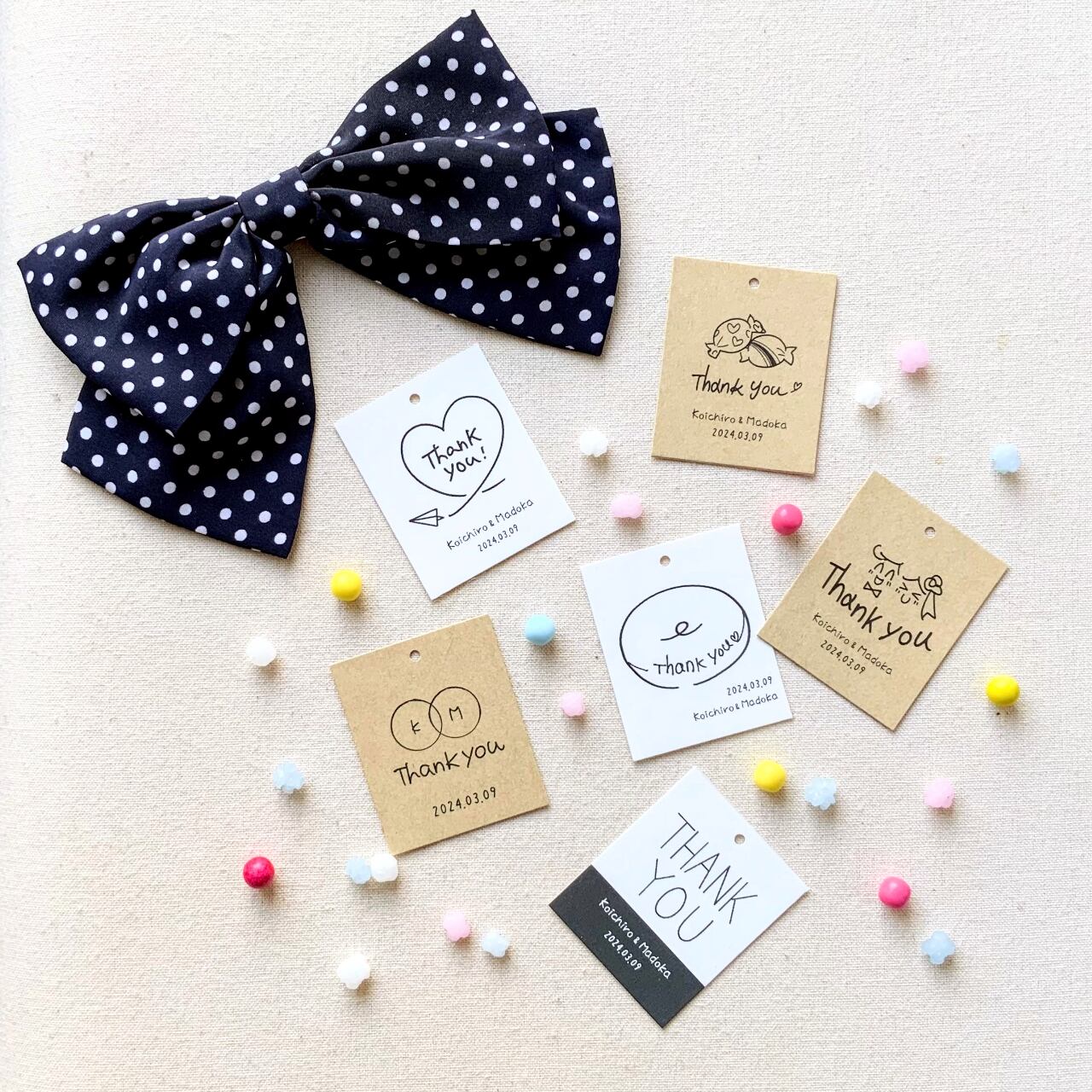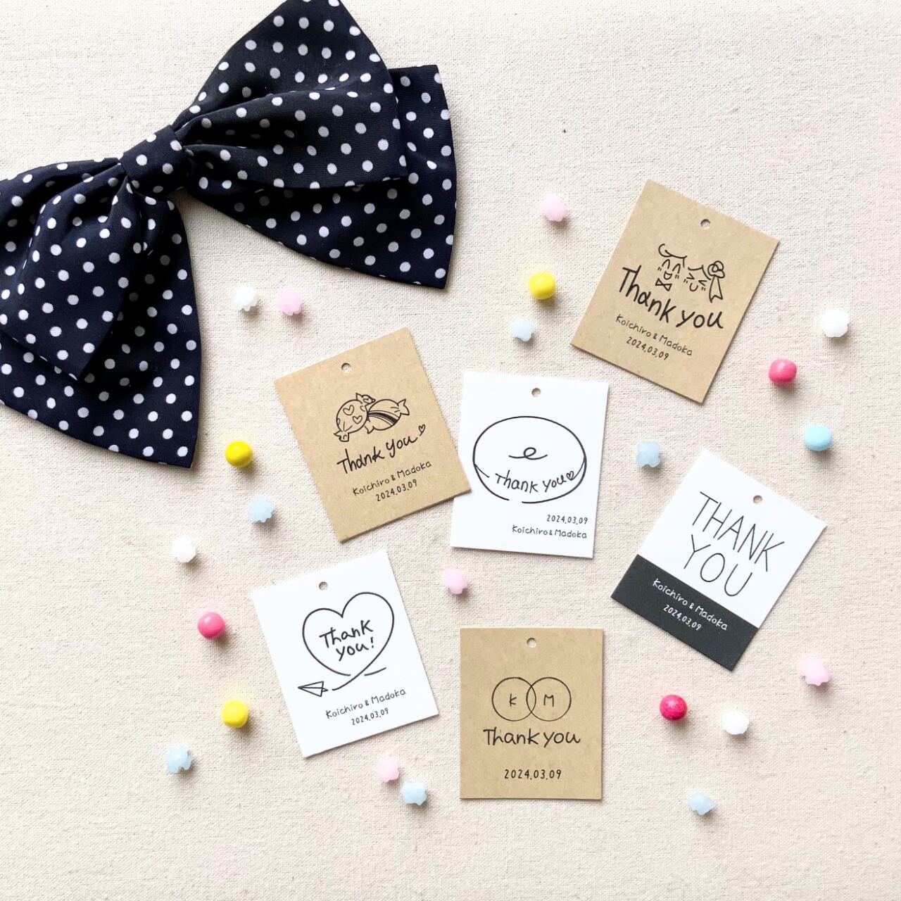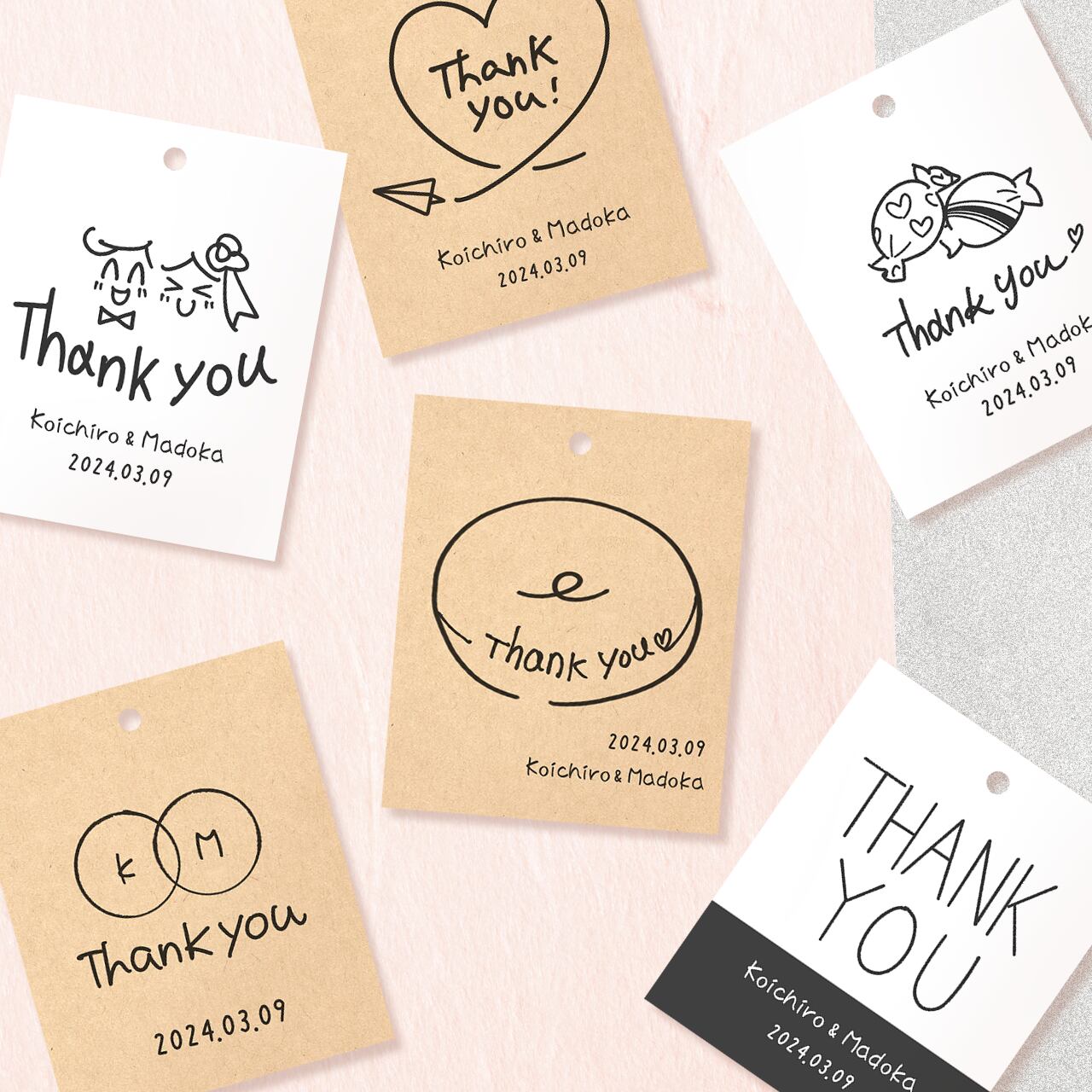 プチギフトや結婚式/二次会に大活躍の、シンプルでやわらかいデザインのサンキュータグです。
